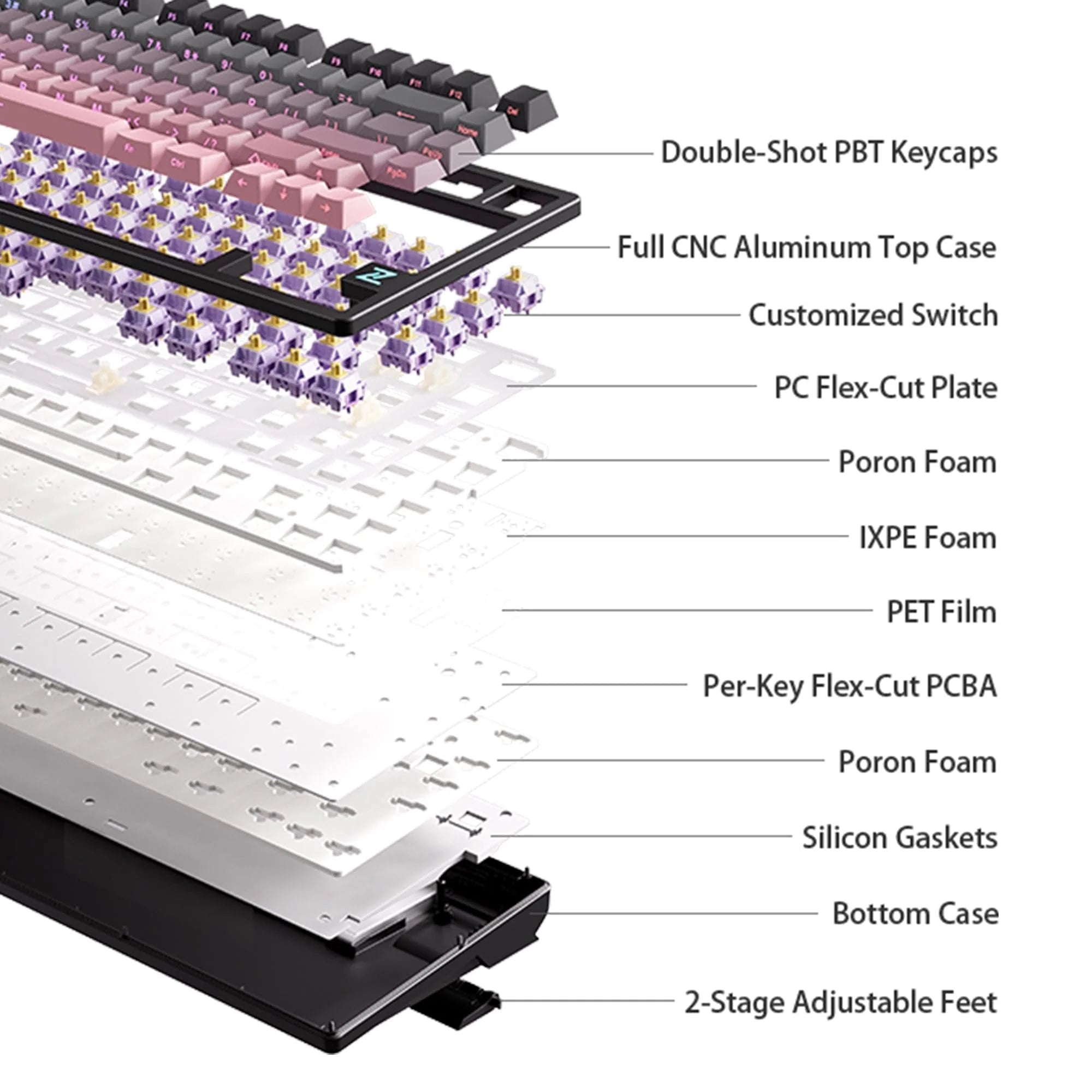 - Sound Dampening Materials: IXPE pads, PET acoustic foam, silicone bottom pads, sandwich cotton
